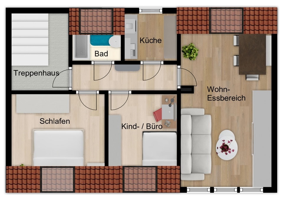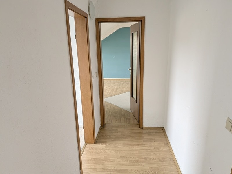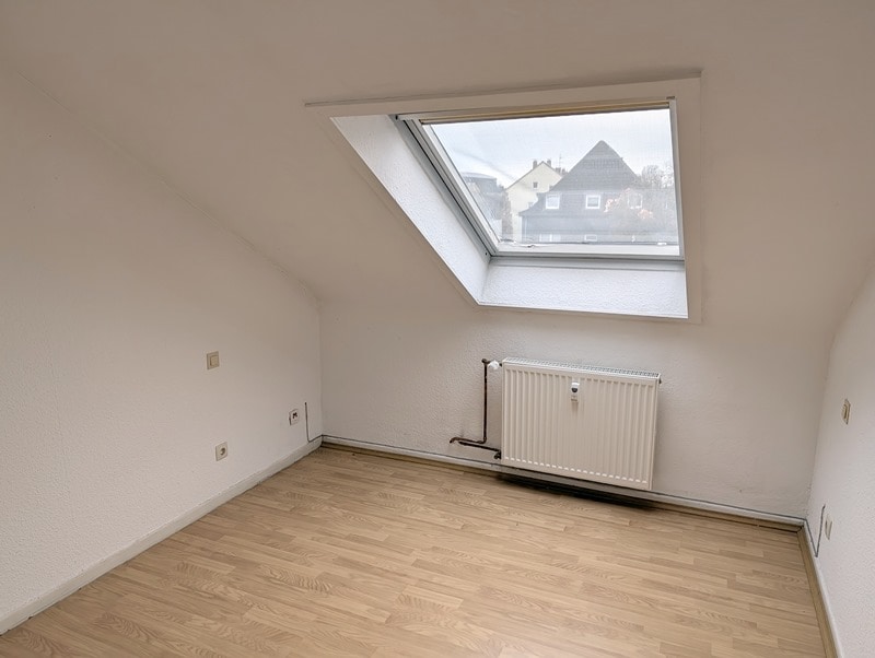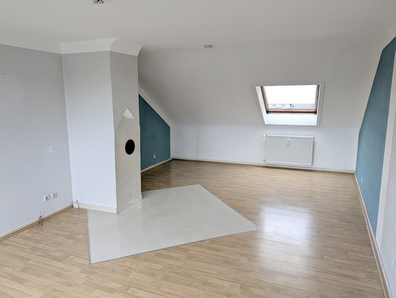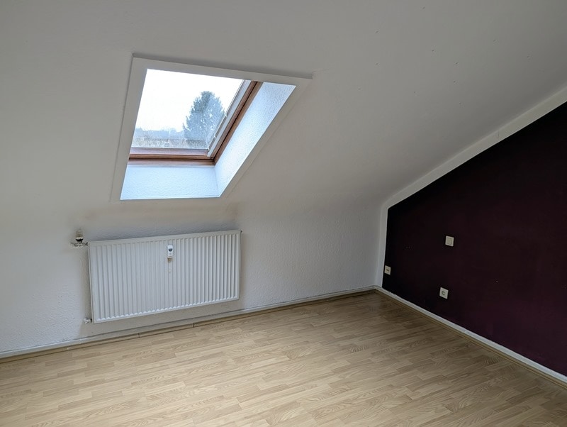 Hier wartet eine praktisch gestaltete Dachgeschosswohnung (2. Etage) in einem 3-Familienhaus auf Sie. Die Wohnung hat ca. 60 m², ein Schlafzimmer, ein Kinderzimmer, ein großes Wohnzimmer, Küche und ein chices Bad. Im Wohnzimmer kann ein Kaminofen angeschlossen werden. Die Wohnung ist durch die Schrägen sehr gemütlich, durch die Gauben im Wohnzimmer und Küche aber auch hell und gut möblierbar.