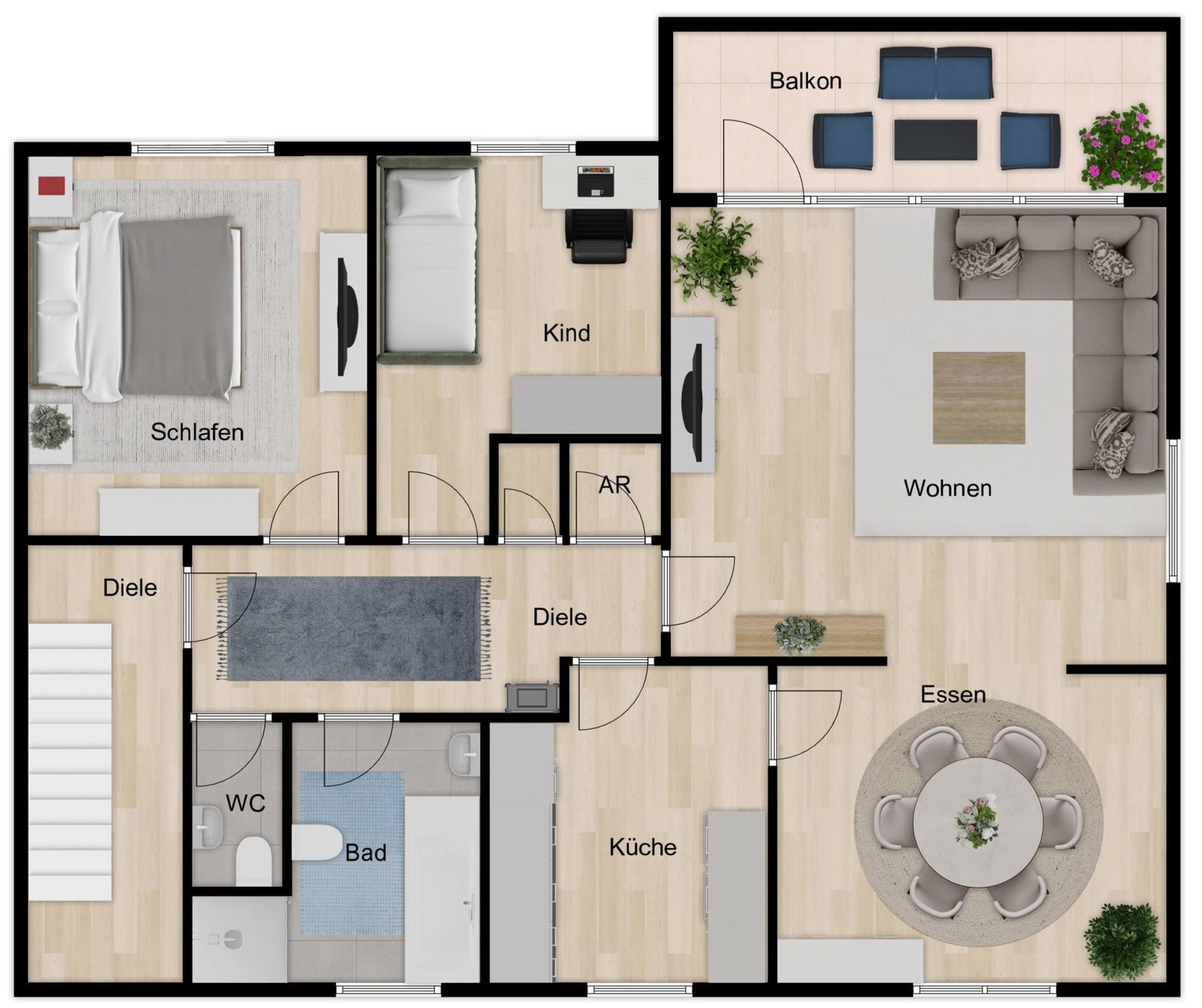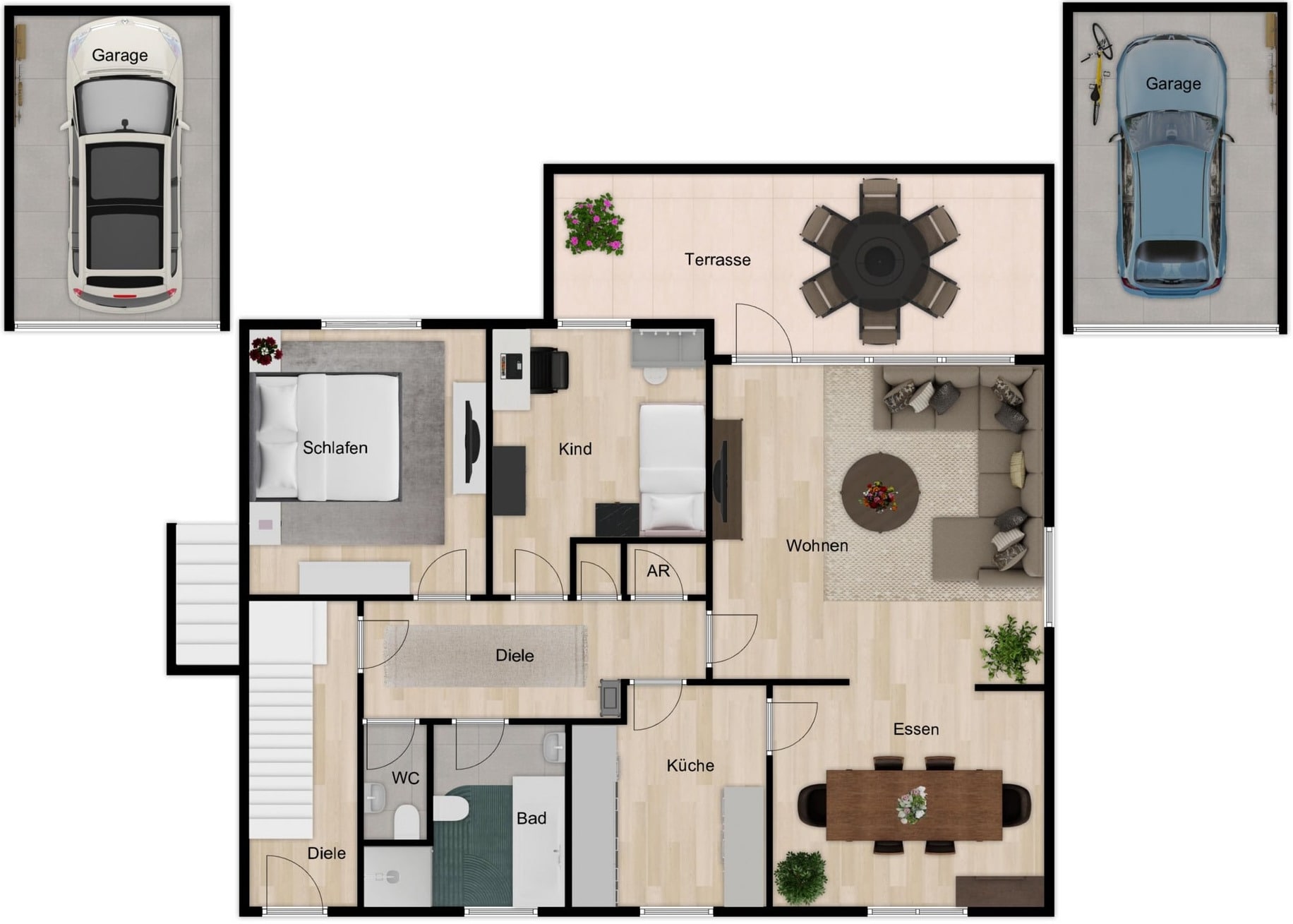 Die Wohnung im Erdgeschoss ist ca. 89 m² groß und verfügt zusätzlich über eine Terrasse sowie einem wohnlich ausgebauten Dachgeschoss.