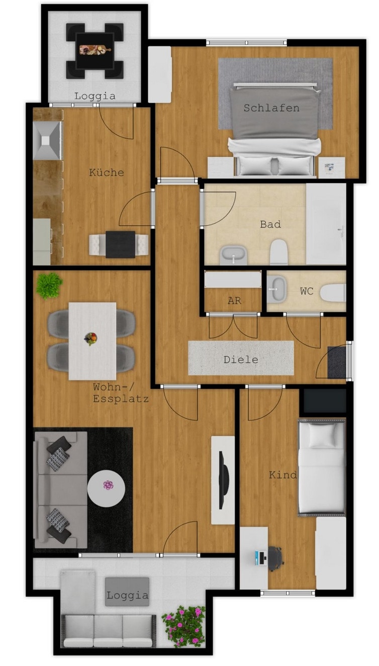 Diese attraktiv geschnittene Eigentumswohnung mit ca. 91 m² bietet ein komfortables Wohnerlebnis in der ersten Etage. Das lichtdurchflutete Wohnzimmer führt direkt auf eine großzügige Terrasse – perfekt für entspannte Stunden im Freien. Zusätzlich lädt ein Balkon, der von der Küche aus erreichbar ist, zum Verweilen ein.