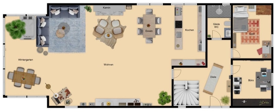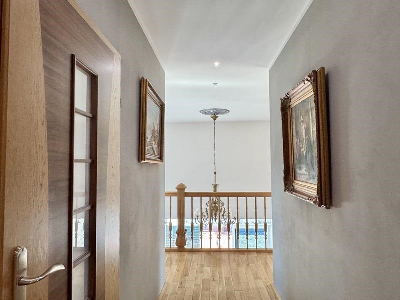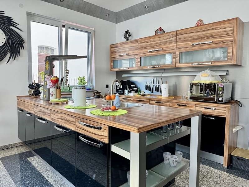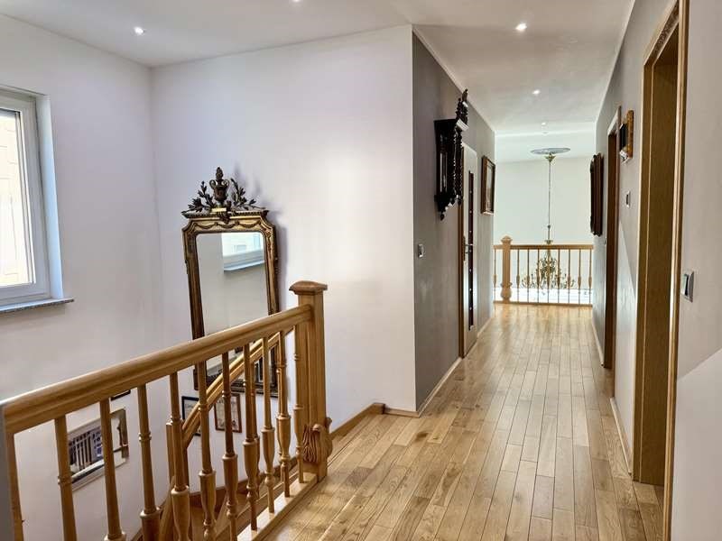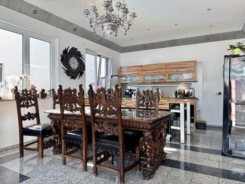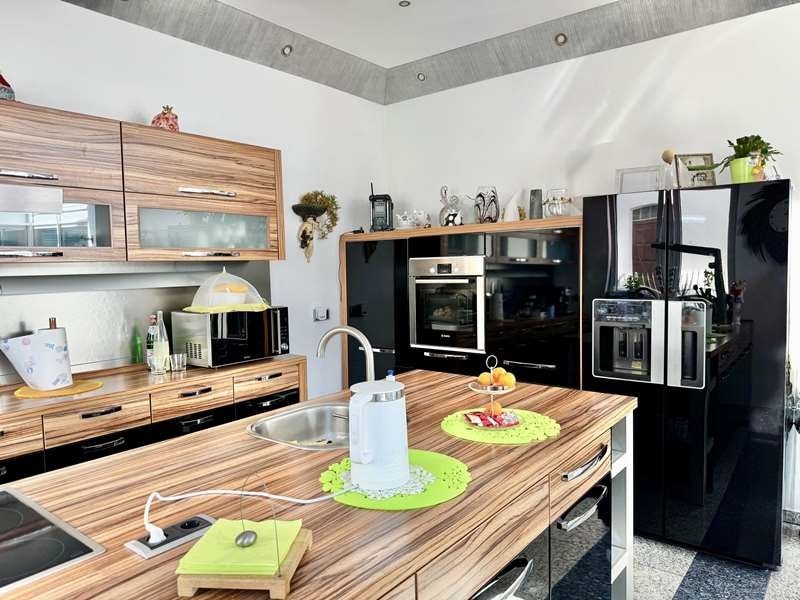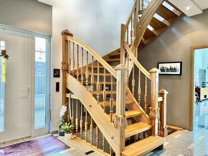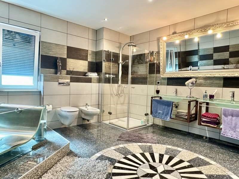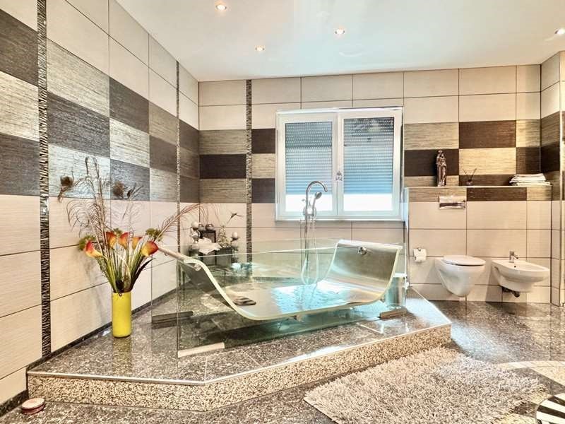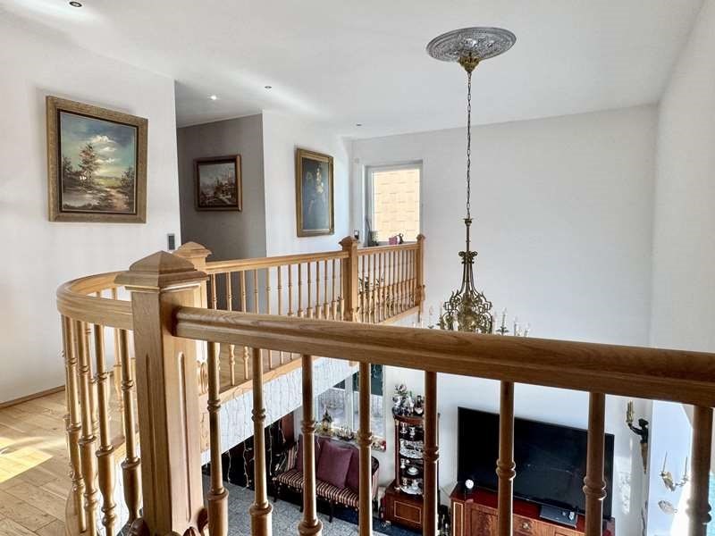 Von außen erscheint es unscheinbar und offenbart seine Qualitäten beim Eintritt durch das automatische Grundstückstor. Eine Videogegensprechanlage am Tor garantiert Ihnen Ihre Privatsphäre, ebenso wie die nach außen verspiegelten dreifach verglasten Fenster die Sie vor fremden Blicken schützen. Empfangen werden Sie im Haus von einer großzügigen Diele. Auf der rechten Seite befinden sich ein Büro und ein Kinderzimmer/Gästezimmer, sowie ein hochwertig ausgestattetes, barrierearmes Duschbad mit Tageslicht. Eine stilvolle Massivholztreppenhaus geleitet Sie von der Diele aus in die obere Etage. Wenn Sie das Treppenhaus links liegen lassen gelangen Sie in den großzügigen, offenen Wohn-, Ess-, und Küchenbereich mit angrenzendem Wintergarten und Jacuzzi. Herzstück des Wohnzimmers ist ein großzügiger Kamin der zu gemütlichen Stunden mit Familie und Freunden einlädt. Die offene Küche und der angrenzende Essbereich fördern die Kommunikation. Der gesamte Bereich ist durch die vielen Fenster und den angrenzenden Wintergarten wunderbar lichtdurchflutet. Sollte es Ihnen aber einmal zuviel werden, können Sie bequem die elektrischen Rollläden runterlassen und den Wintergarten verschatten. Die Galerie mit dem hierdurch entstehenden Luftraum verleiht dem Raum noch mehr Luftigkeit und Großzügigkeit. Im Obergeschoss befinden sich noch zwei gleichwertig große Kinderzimmer, ein Schlafzimmer mit Bad-en-suite, sowie eine Ankleide und eine Galerie mit Blick in den Garten. Das Bad ist überdurchschnittlich gut ausgestattet mit freistehender Badewanne, barrierearmer Dusche, zwei Waschbecken mit Unterschränken, Bidet, Toilette und großen Badmöbeln für alle erforderlichen Utensilien und Frottierwaren. Luxus pur.