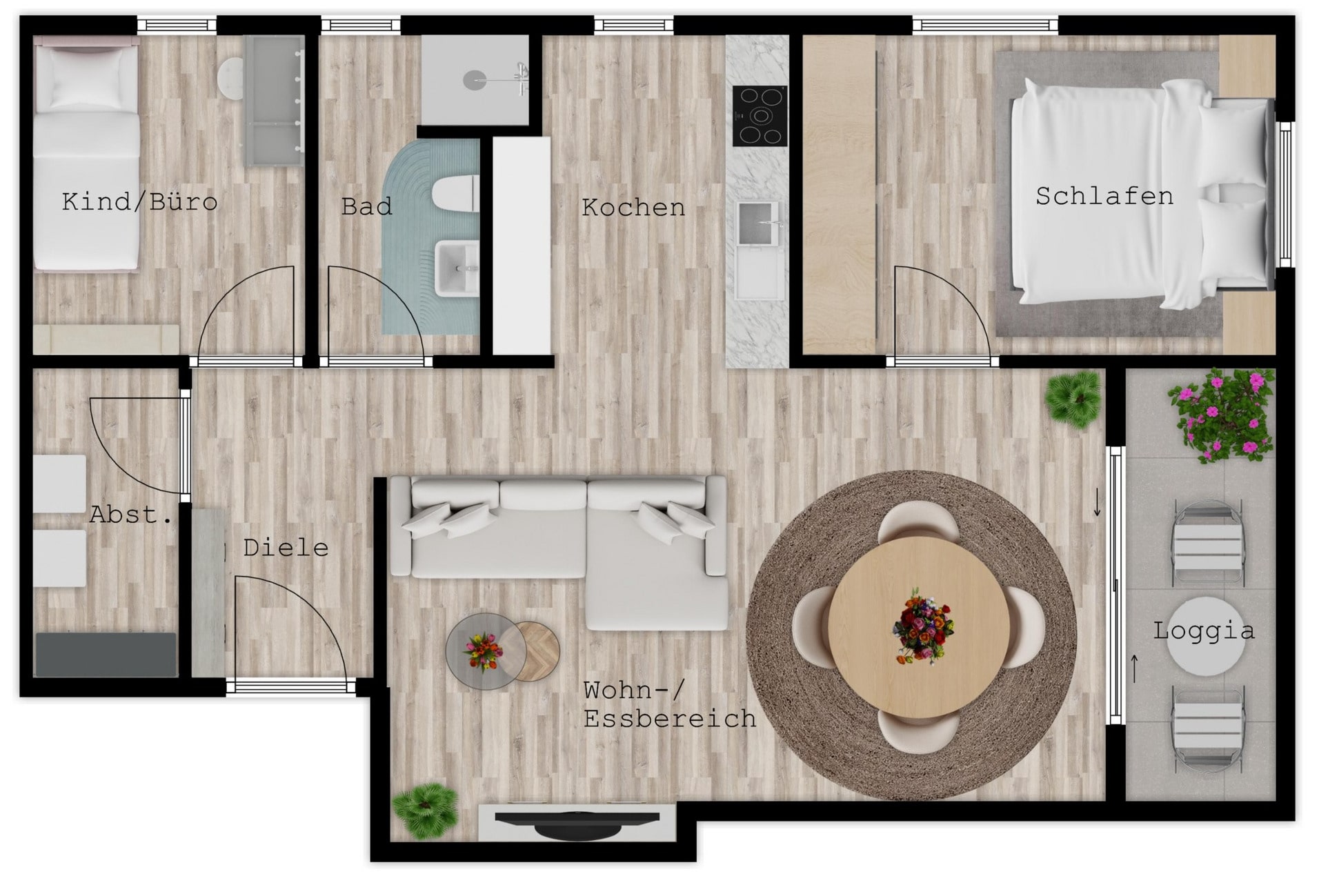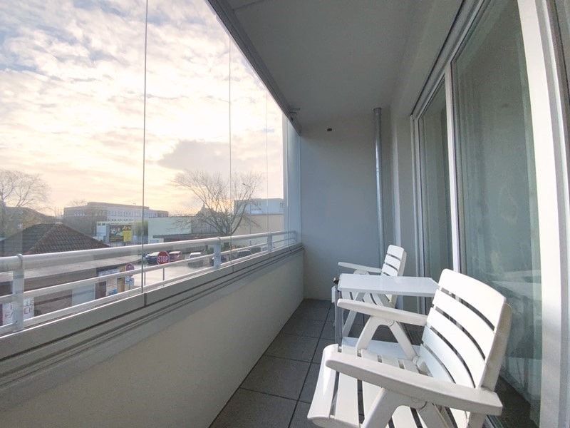 Große, bodentiefe Fenster sorgen für viel Tageslicht und sind mit elektrischen Rollläden ausgestattet. Vom Wohnbereich aus erreichen Sie die geschützte Loggia, die dank beweglicher Glaselemente auch bei Regen nutzbar ist.