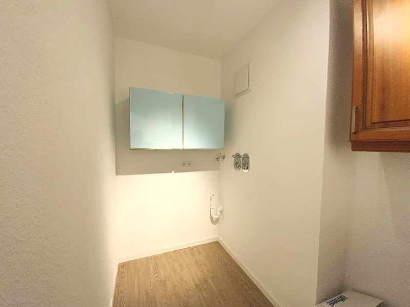 Neben dem Schlaf- und Kinderzimmer befindet sich das hell geflieste Tageslichtbad mit einer ebenerdigen Dusche. Ein separater Hauswirtschaftsraum bietet Platz für Waschmaschine und Trockner.