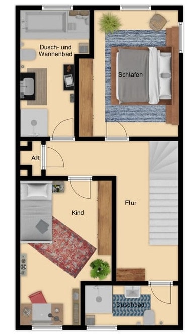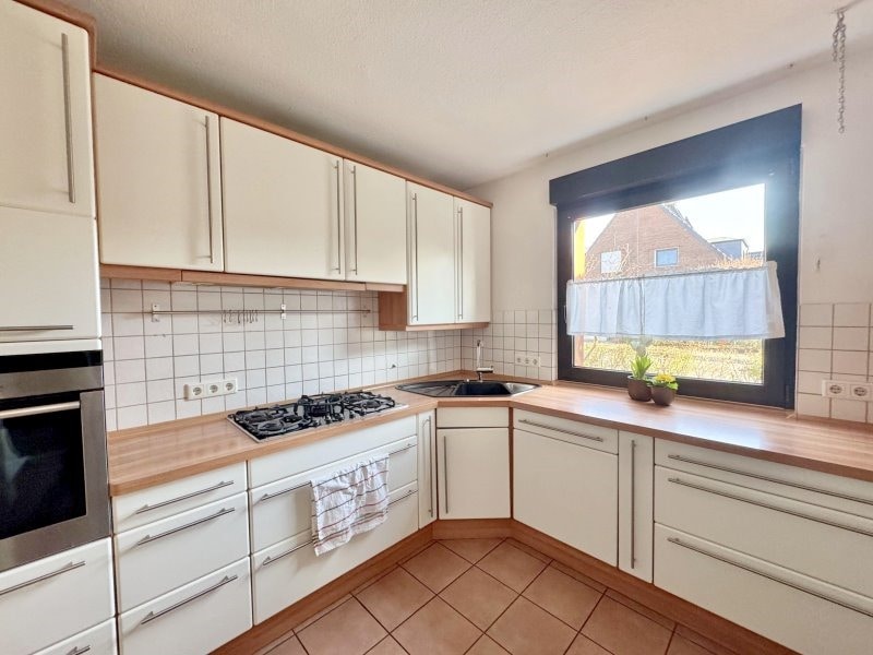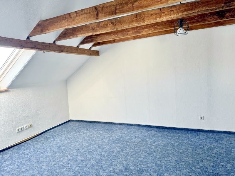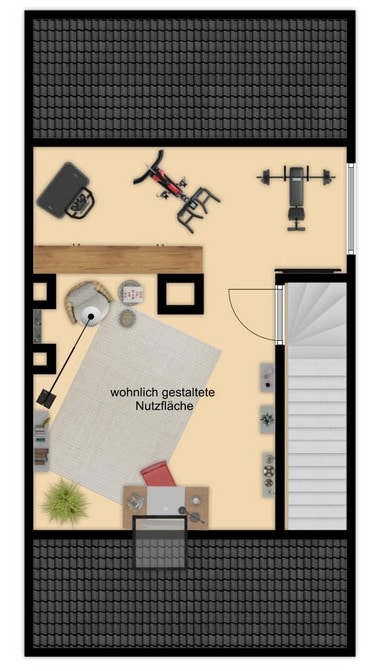 Es folgt die klassische Raumaufteilung mit Küche und Wohn- Esszimmer und Gäste-WC im Erdgeschoss. Besonders ist jedoch das vorgelagerte Treppenhaus, das den Bewohnern die bestmögliche Privatsphäre bietet. Die Küche ist zur Straße ausgerichtet und verfügt über eine gute Größe, so dass man auch einen Frühstückstisch aufstellen kann. Kochliebhaber freuen sich über den Gasherd. Natürlich kann man jederzeit auch bei Bedarf auf Strom umrüsten. Im Wohn- und Esszimmer sorgt ein Ofen für eine gemütliche Atmosphäre im Winter. Der Garten und die teilweise überdachte Terrasse sind bequem vom Wohnzimmer aus zu erreichen. Der Garten ist pflegeleicht angelegt und bietet allen Familienmitgliedern Platz zum Spielen, Grillen, Chillen. Im Obergeschoss sind das Elternschlafzimmer und ein großes Kinderzimmer beheimatet. Zwei Tageslichtbäder, ein Duschbad und ein Dusch- und Wannenbad, sorgen für einen entspannten Start in den Tag. Zusätzlich ist noch ein praktischer Abstellraum auf der Etage um Staubsauger und Co diskret zu verstauen. Das Dachgeschoss mit der wohnlich gestalteten Nutzfläche bietet ihnen die Möglichkeit ein Homeoffice zu errichten oder bei mehreren Kindern ein Spielzimmer einzurichten, wenn man das Kinderzimmer im Obergeschoss als gemeinsames Schlafzimmer gestaltet.