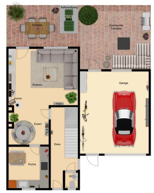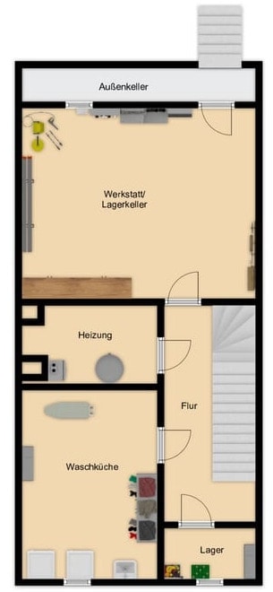 Das Haus ist voll unterkellert mit Außentreppe in den Garten und erfüllt so die Anforderungen an ein „komplettes“ Haus. Die übergroße Garage trägt ihr Übriges dazu bei.