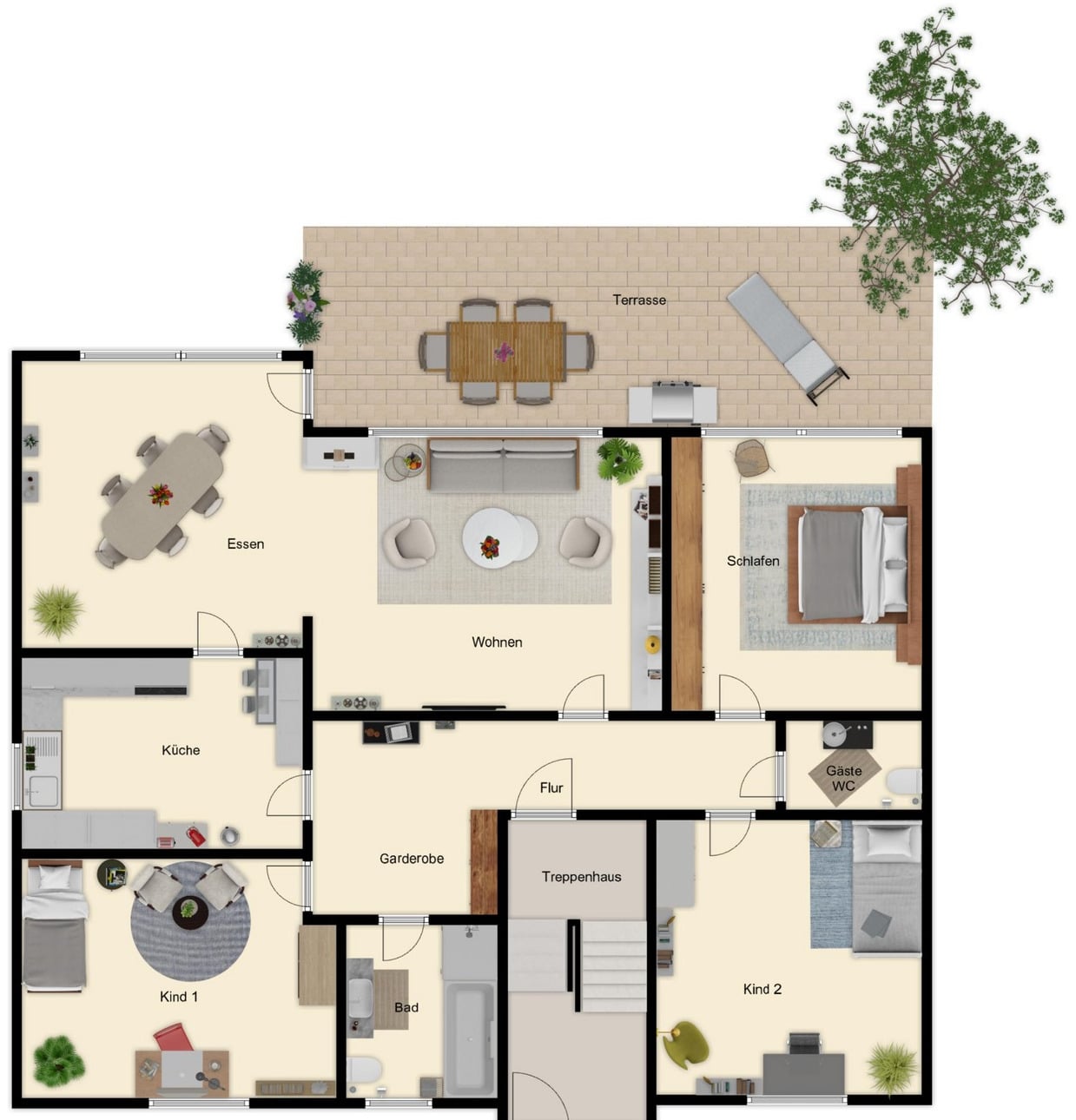 Der Eingang in die Wohnung liegt relativ zentral. Empfangen werden Sie von einer geräumigen Diele mit Garderobe von der alle weiteren Räume abgehen. Vor Kopf liegt das Wohnzimmer mit Panoramablick in den gemeinschaftlichen Garten, der allerdings in der Vergangenheit auch nur von der Erdgeschosswohnung genutzt wurde. Ein Durchbruch zum Esszimmer schließt sich auf der linken Seite an. Von hier aus gelangen Sie auch auf die zur Wohnung gehörende Terrasse mit zwei Sonnenmarkisen und in die Küche. Die Küche hat eine ansprechende Größe und bietet viele praktische Staumöglichkeiten und Platz für einen kleinen Frühstückstisch. Neben der Küche liegt zur Straße hin ein gut geschnittenes Kinderzimmer. Direkt angrenzend ist das neugestaltete, barrierearme Tageslichtbad mit Dusche und Wanne. Auf der rechten Wohnungsseite befindet sich das zweite, gleichwertig große Kinderzimmer, das renovierte Gäste-WC und das große Schlafzimmer. Die Wohnung präsentiert sich in einem sehr gepflegten Zustand und wurde vor kurzen noch einmal saniert. Die Bäder wurden erneuert, die Innentüren wurden ausgetauscht, es wurde ein Dielenparkett im Wohn- und Esszimmer verlegt und die Decken wurden mit Rigips abgehangen und mit zeitgemäßen LED-Spots versehen. Die Fenster/Scheiben sind überwiegend ausgetauscht und alle Fenster zur Gartenseite sind abschließbar und verfügen über Rollläden. Zu der Wohnung gehört noch eine Garage und ein davor liegender Carport. Die Haustüranlage wurde vor kurzem noch ausgetauscht. Die Gaszentralheizung wurde 2007 erneuert und die Heizkörper in der Wohnung im Rahmen der Sanierung. Die Rücklage des Hauses ist gut gefüllt. Insgesamt verkörpert die Wohnung ein rundum glücklich Paket. Überzeugen Sie sich selbst bei einer Besichtigung.