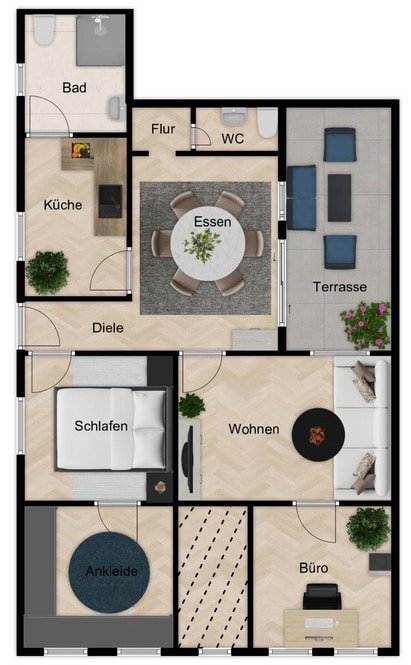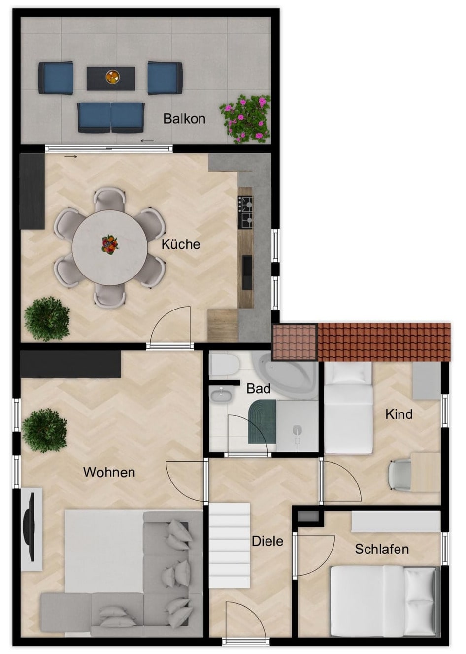 Die Eigentümerwohnung befindet sich im Obergeschoss und umfasst ca. 113 m² mit vier Zimmern sowie einer ansprechenden Dachterrasse, die Erholung und sonnige Stunden im Freien garantiert. Der Bezug dieser Wohnung ist nach Absprache möglich.